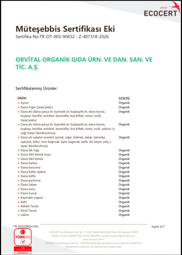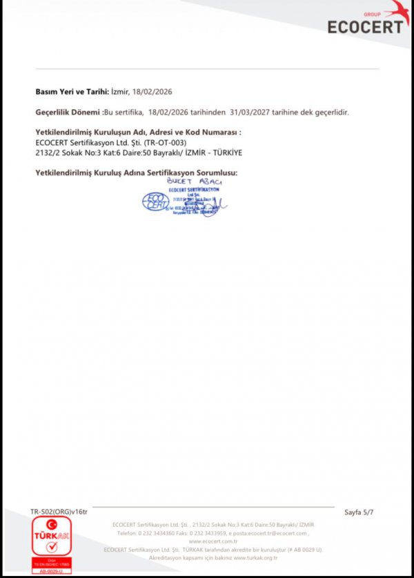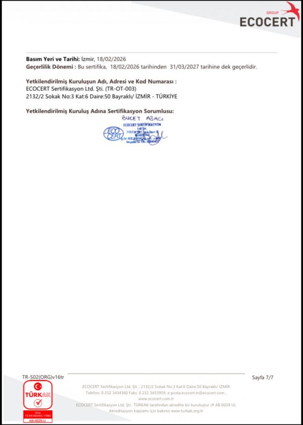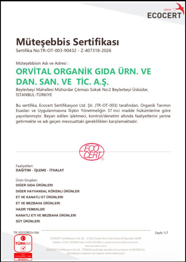 所有 Orvital(欧热维塔利) 产品均通过国际认证机构 Ecocert IMO Audit and Certification Ltd. 的认证。获得了 (TR-OT-003) 和 土耳其共和国食品、农业和畜牧业部的认证。